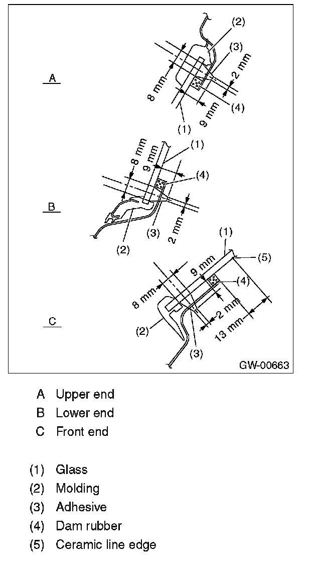 5. Apply adhesive in the same procedure as for windshield glass.