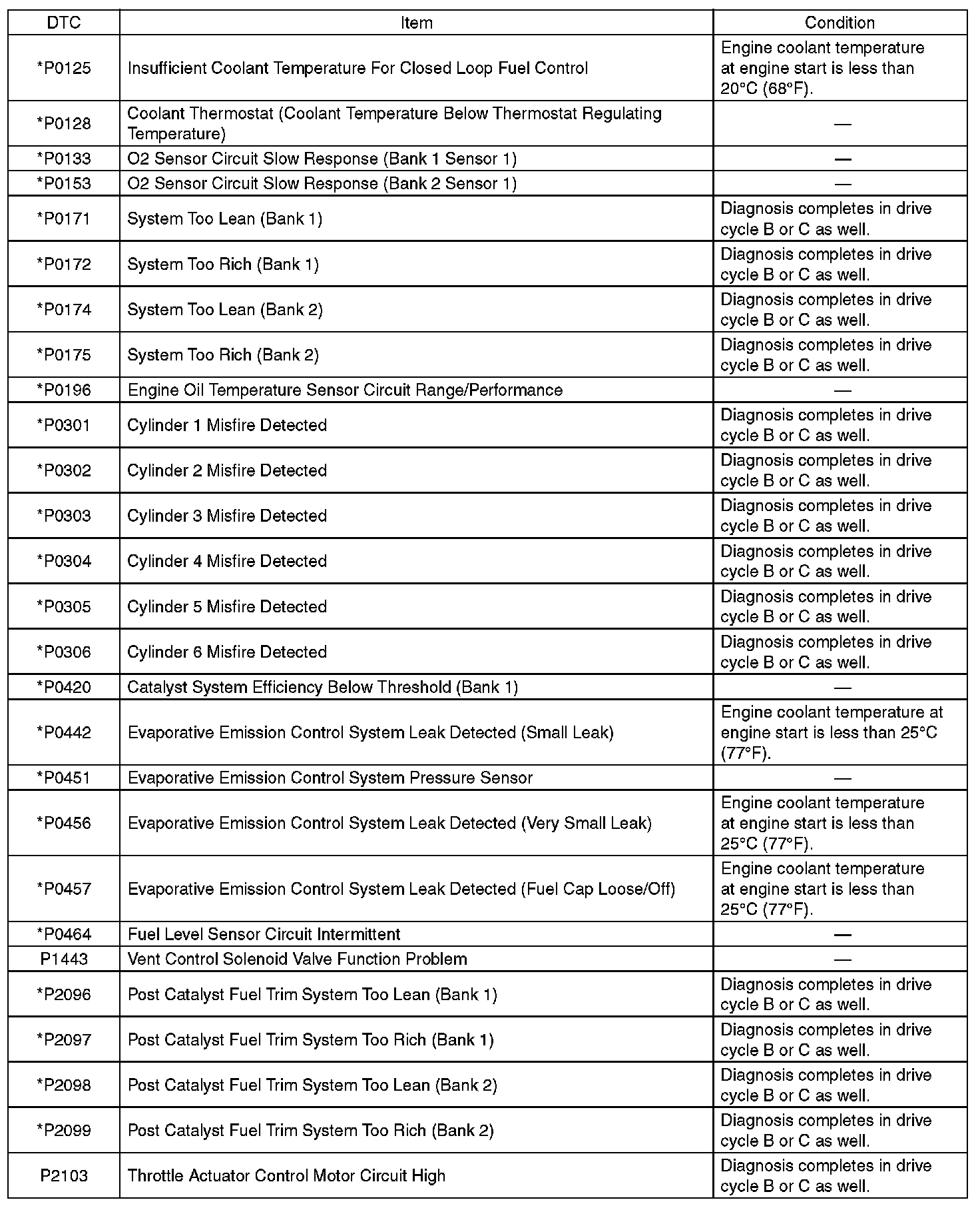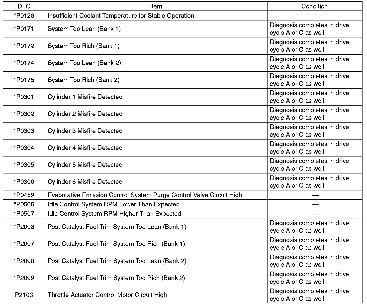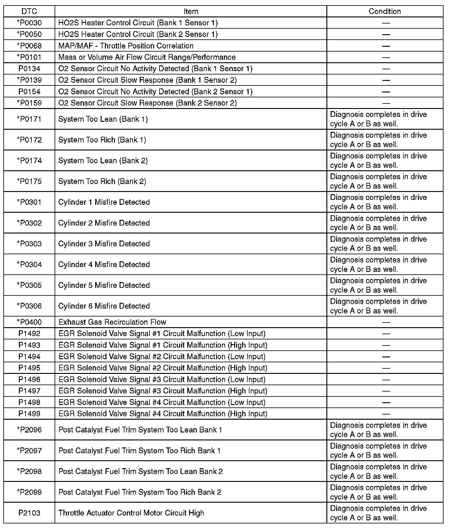 - Perform the diagnosis twice if the DTC marked with *. After completing the first diagnosis, stop the engine and perform second diagnosis in same condition.