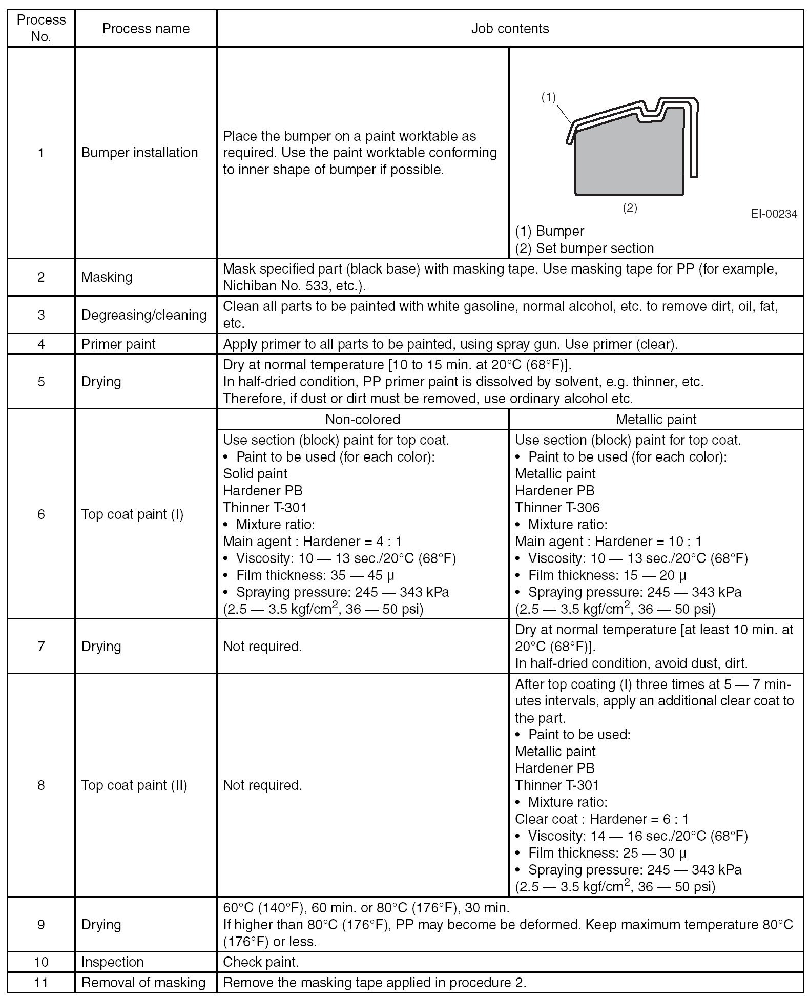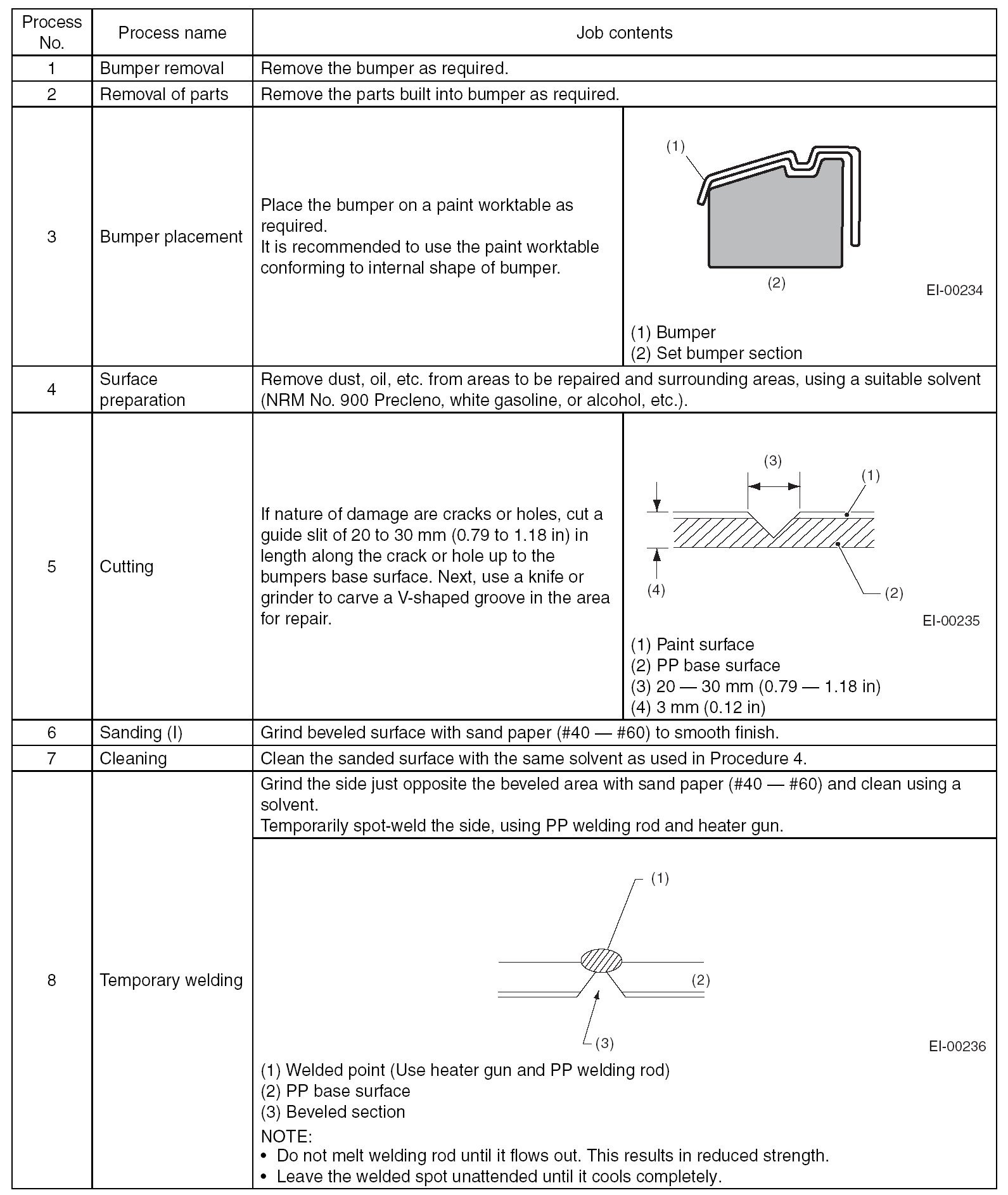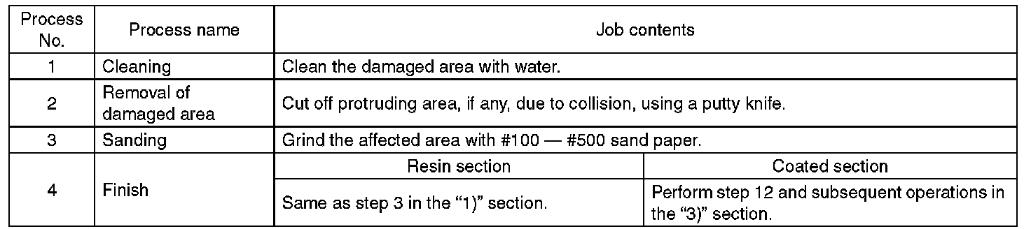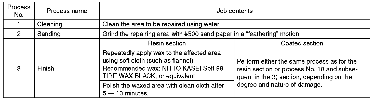 - All PP bumpers are provided with a grained surface, and if the surface is damaged, it cannot normally be restored to its former condition. Damages limited to the shallow scratches that cause only a change in the luster of the base material or coating, can be almost fully restored. Before repairing a damaged area, explain this point to the customer and obtain an understanding about the matter.