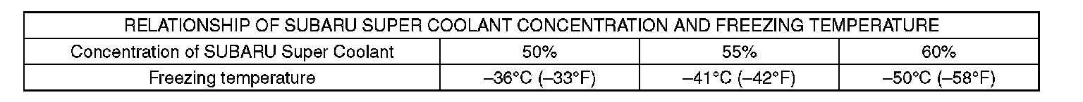 CAUTION: SUBARU Super Coolant concentration must be used from 50 to 60 % to assure the best performance of the anti-freeze and anti-rust agents.
