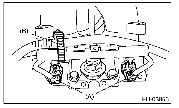 9. Remove the harness band (B) which holds the engine harness to injector pipe.