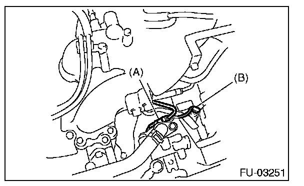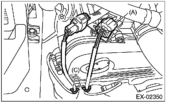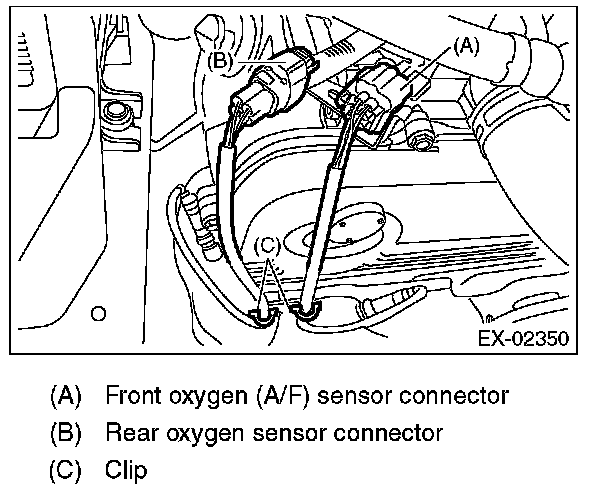 17. Disconnect tine front oxygen (A/F) sensor connector (A) and rear oxygen sensor connector (B) and remove tine clip (C) fastening the harness.