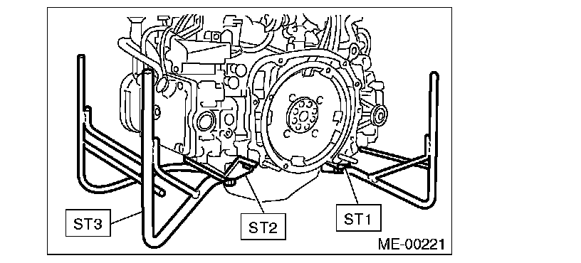 1) After removing the engine from body, secure it to ST in the following procedure.