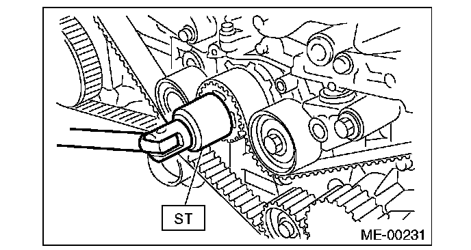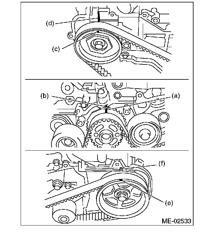 1) Use the ST to turn crankshaft. Align the mark (a) of sprocket to the cylinder block notch (b), and then ensure the right side cam sprocket mark (c), cam cap and cylinder head matching surface (d) or left side cam sprocket mark timing belt cover notch (f) are properly adjusted.