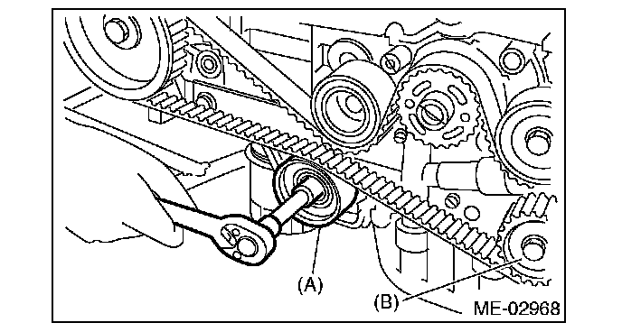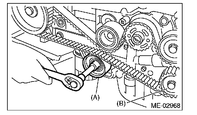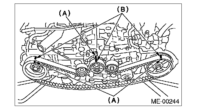 4) While aligning the alignment mark (B) on timing belt with the mark (A) on sprockets, position the timing belt properly.