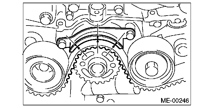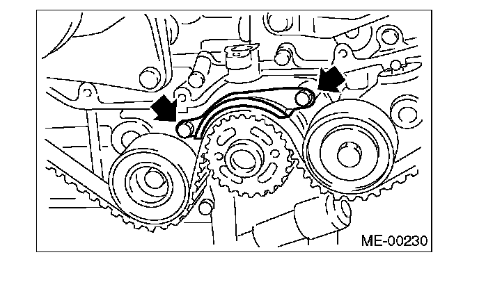 2) Using white paint, put an alignment mark or an arrow mark on timing belts in relation to the crank sprocket and cam sprockets.