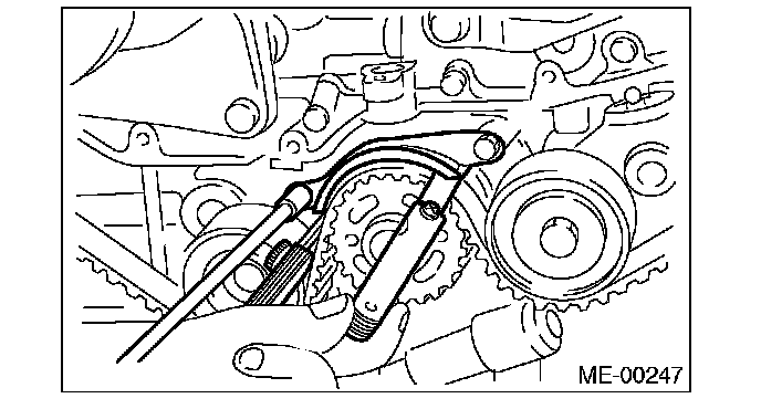 7) After ensuring the marks on timing belt and camshaft sprockets are aligned, remove the stopper pin from belt tension adjuster.