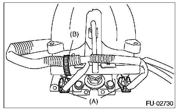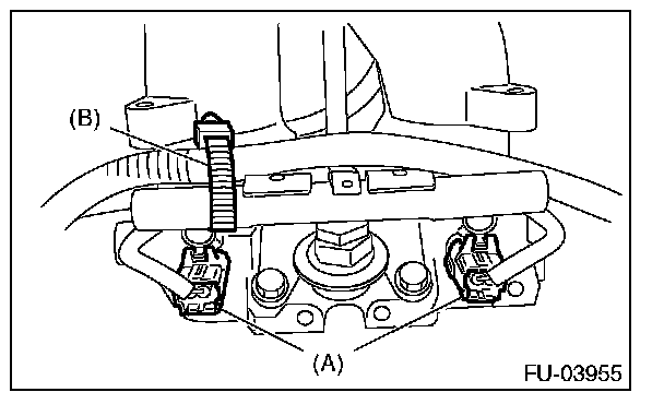 7. Remove the harness band (B) which holds the engine harness to injector pipe.