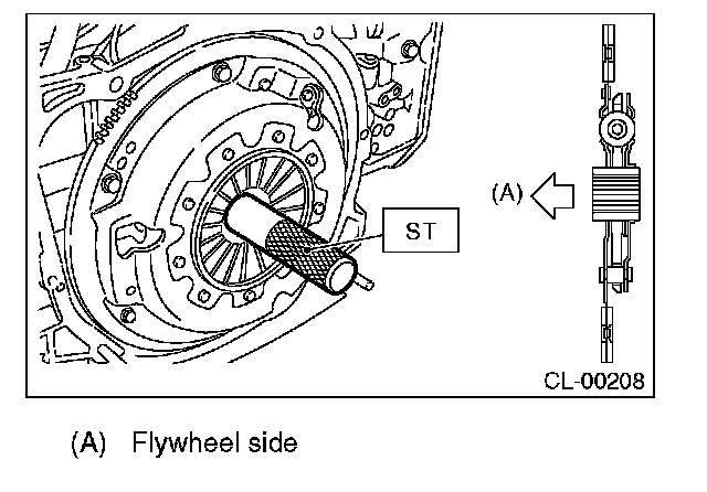 1) Insert the ST into the clutch disc and attach to the flywheel by inserting the ST end into pilot bearing.