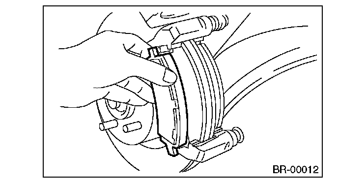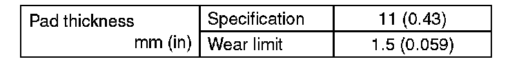 - A wear indicator is installed on the inner disc brake pad. If the pad is worn to the limit, the end of wear indicator contacts disc rotor, and a squeaking sound is heard as the wheel rotates. If the sound is heard, replace the pad.