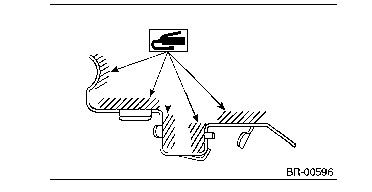 1) Apply a thin coat of Molykote M7439 (Part No. K0770YA000) or grease contained in the pad kit to the pad clip.