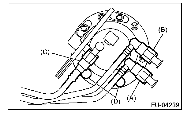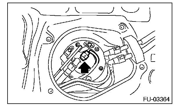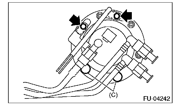 - Align protrusion (B) of the fuel sub level sensor to the cut out in the fuel sub level sensor upper plate.