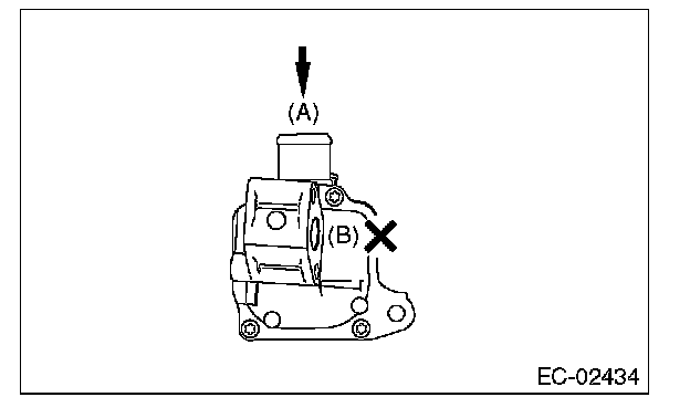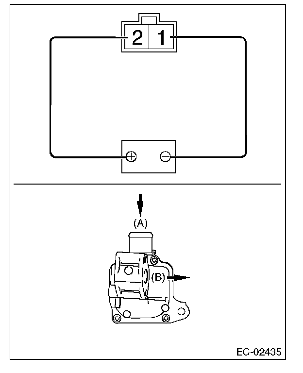 3. Connect the terminal No. 2 to the battery positive terminal and the terminal No. 1 to the battery negative terminal. When supplying air to (A), check that air is discharged from (B).