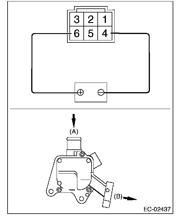 3. Connect the terminal No. 6 to the battery positive terminal and the terminal No. 4 to the battery negative terminal. When supplying air to (A), check that air is discharged from (B).
