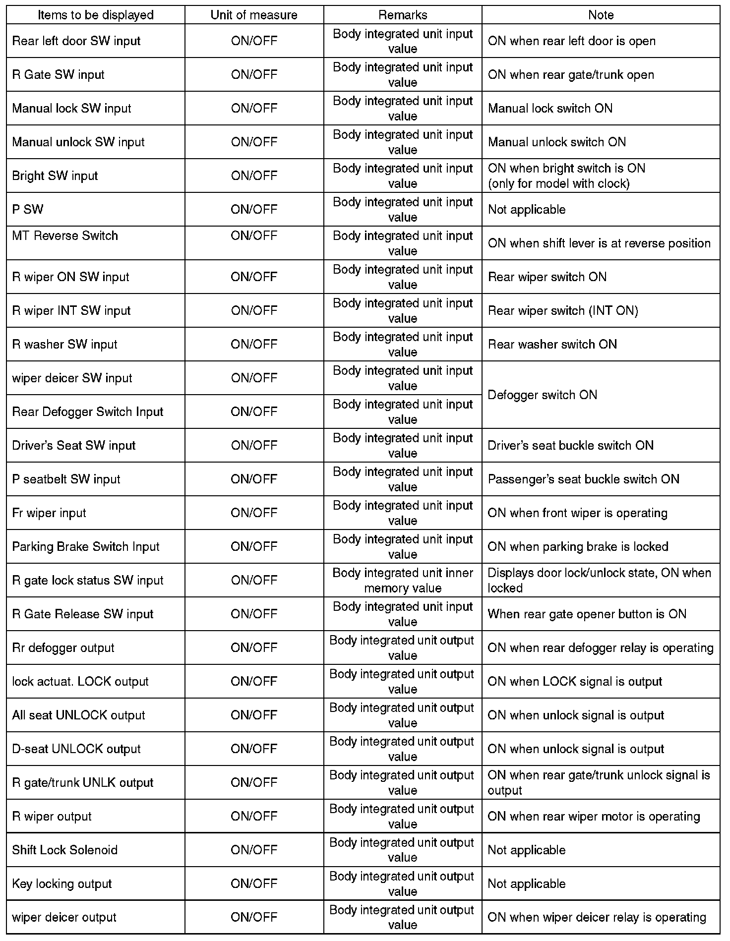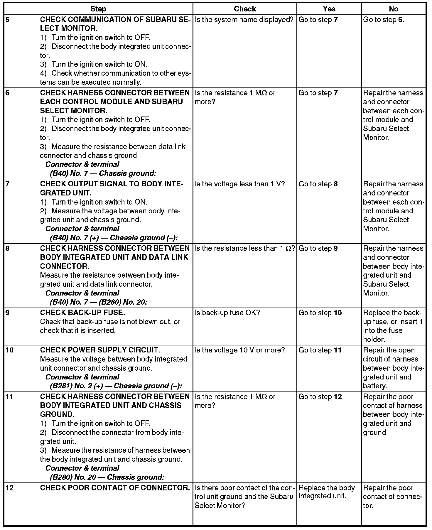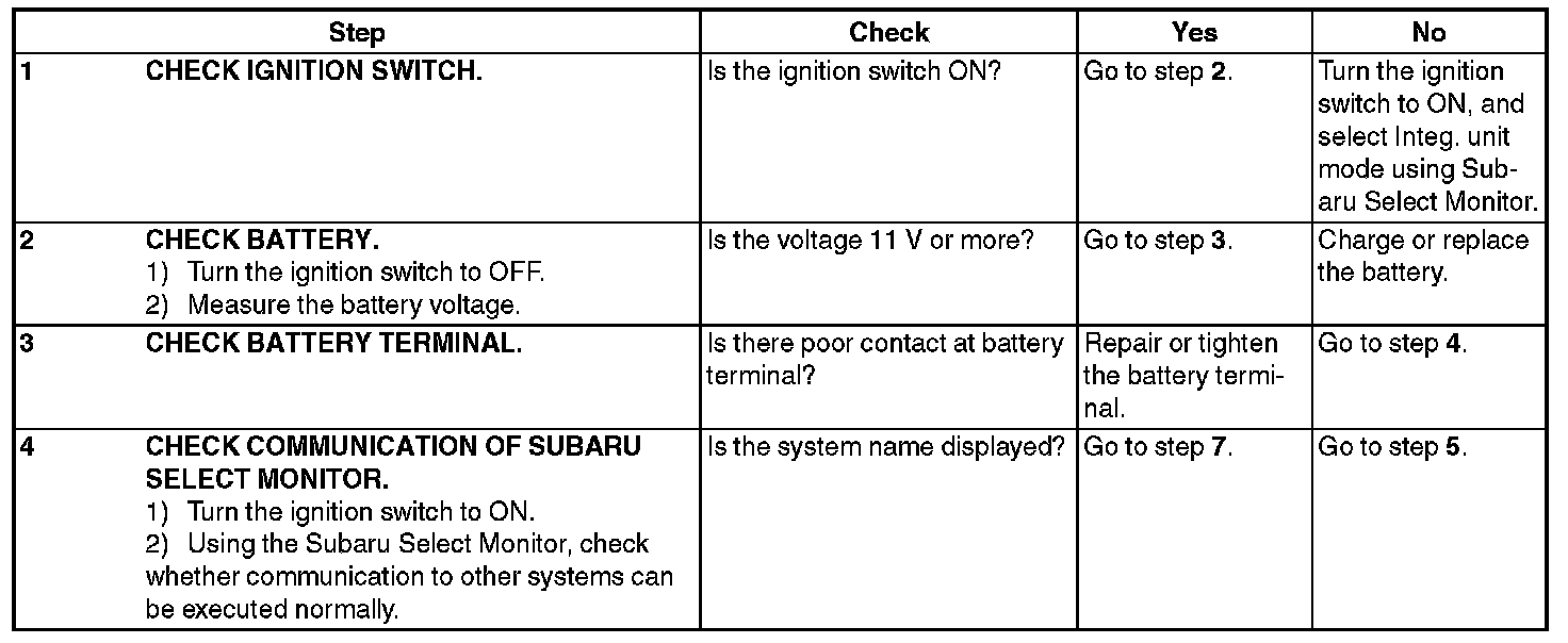 In order to check the body integrated unit function, inspect the body integrated unit and actuator using Subaru Select Monitor without operating switches.