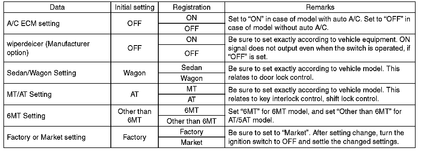 If registrations and function setting are different from vehicle equipment, vehicle system does not operate normally and diagnosis cannot be performed correctly. Pay attention to following item.