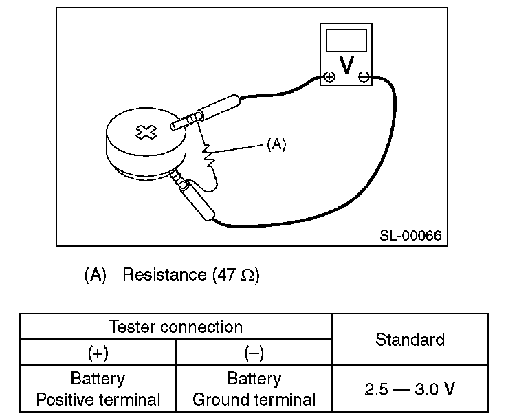 Measure the voltage between the keyless transmitter battery (+) terminal and (-) terminal.