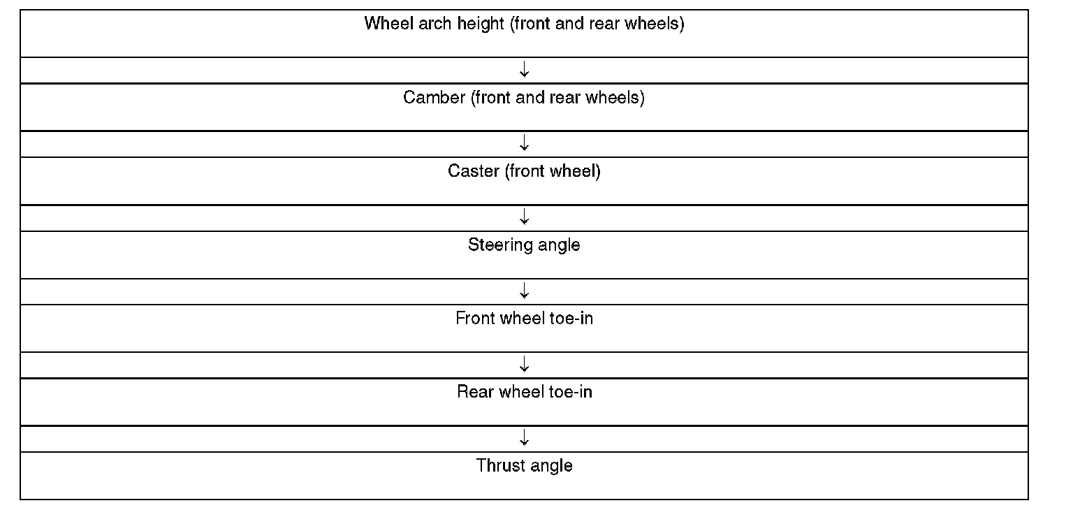Check, adjust and measure the wheel alignment in accordance with the procedures indicated in the figure.