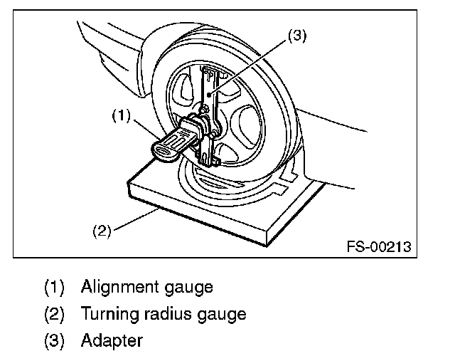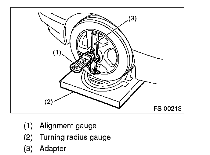 1) Place the front wheel on the turning radius gauge. Make sure the ground contact surfaces of the front and rear wheels are at the same height.