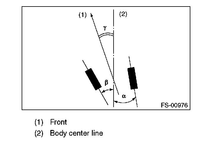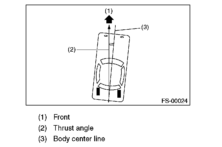 Thrust angle is a mean value of left and right wheel toe angles in relation to the vehicle body center line. Vehicle is driven straight in the thrust angle direction while slanting in the oblique direction depending on the degree of the mean thrust angle.