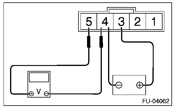 3. Connect the battery positive terminal to terminal No.3 and the battery ground terminal to terminal No.4, the circuit tester positive terminal to terminal No.5 and the circuit tester ground terminal to terminal No.4.