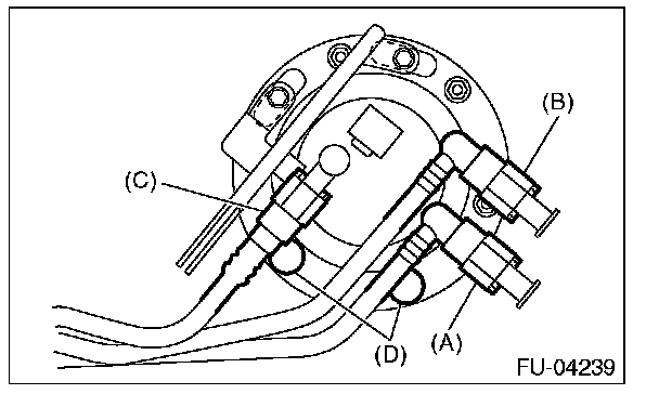 7. Disconnect the quick connectors of fuel delivery tube (A), fuel return tube (B), and jet pump tube (C).