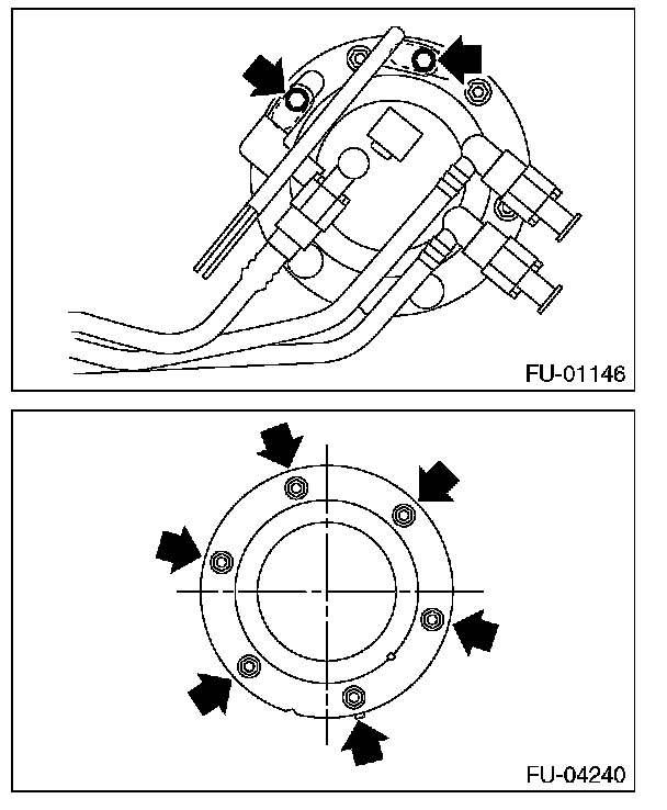 9. Remove the bolts and nuts which hold fuel sub level sensor protector and fuel sub level sensor upper plate to the fuel tank.