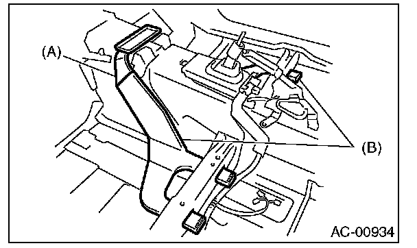 4. Pull off the floor mat to remove the rear center heater duct (A) and rear heater duct LH, RH (B).