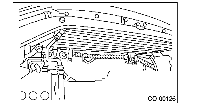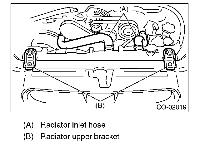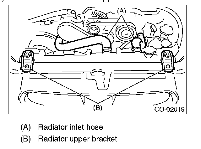 NOTE: Make pins on the lower side of radiator be fitted into the radiator lower cushions on body side.