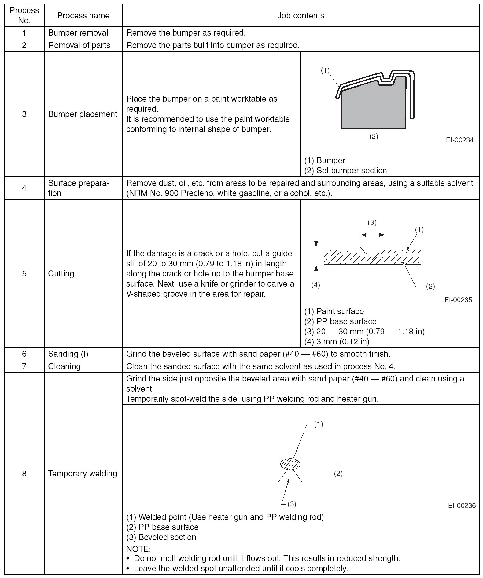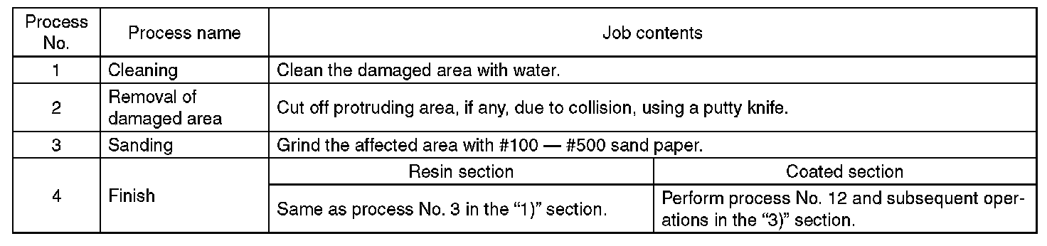 NOTE: All PP bumpers are provided with a grained surface, and if the surface is damaged, it cannot normally be restored to its former condition. Damages limited to the shallow scratches that cause only a change in the luster of the base material or coating, can be almost fully restored. Before repairing a damaged area, explain this point to the customer and obtain an understanding about the matter. Repair methods are outlined below, based on a classification of the extent of damage.