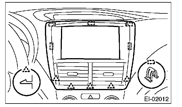 8. Detach the screws and the plastic hooks to remove ornament panel RH.