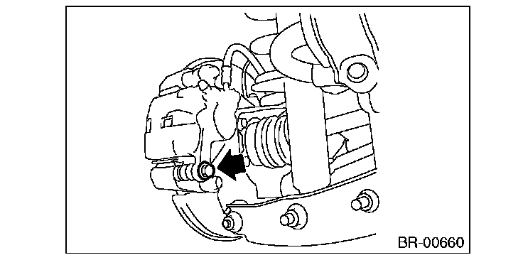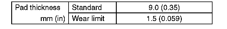 - A wear indicator is installed on the inner disc brake pad. If the pad is worn to the limit, the end of wear indicator contacts disc rotor, and a squeaking sound is heard as the wheel rotates. If the sound is heard, replace the pad.