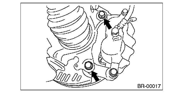 2) Remove the caliper body and the support from housing, and suspend it from the strut using a wire.