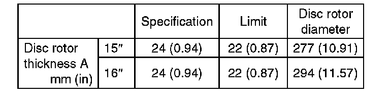 4) Set a micrometer 10 mm (0.39 in) inward from the disc rotor outer perimeter, and then measure the disc rotor thickness. If the thickness of the disc rotor exceeds the service limit, replace with a new disc rotor.