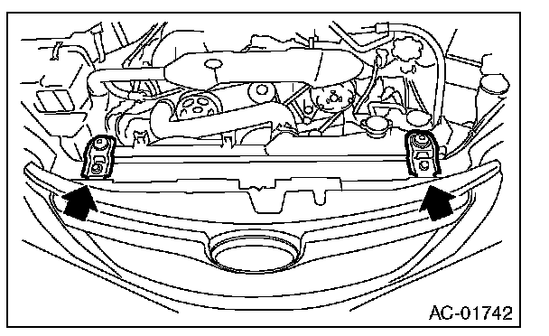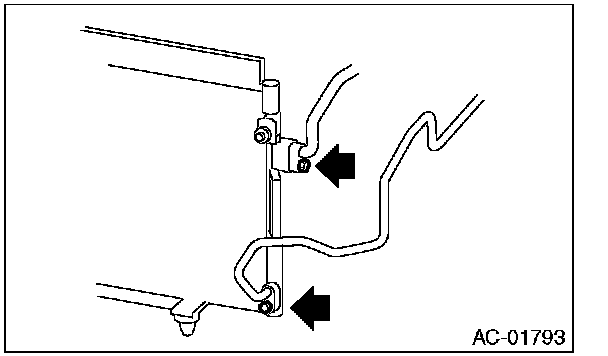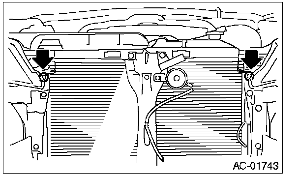 6. Remove two bolts. While lifting the condenser,pull out through space between the radiator and the radiator panel.