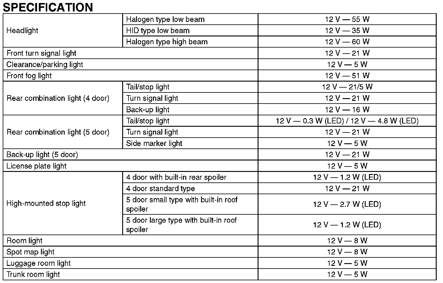 Lighting and Horns: Specifications