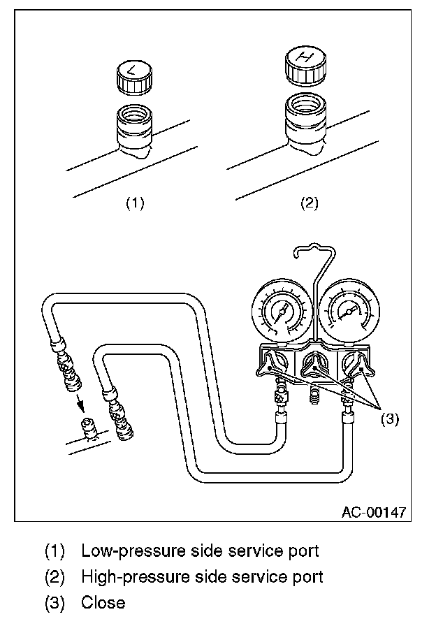 CAUTION: When filling with the engine running, do not open the high pressure side valve. Always fill from the low pressure side.