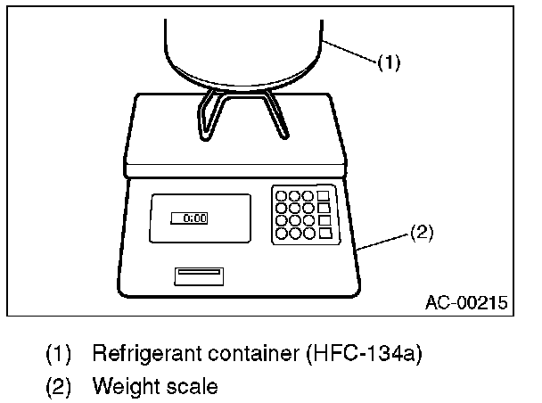 11. When a 13.6 kg (30 lb) refrigerant container is used, measure the amount of refrigerant with a refrigerant charging scale, and connect with the center manifold hose.