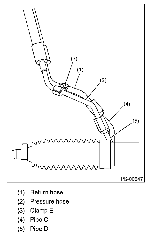 5) Temporarily connect pressure hose and pipe C, and the return hose and pipe D. Temporarily tighten the bolt of clamp E.