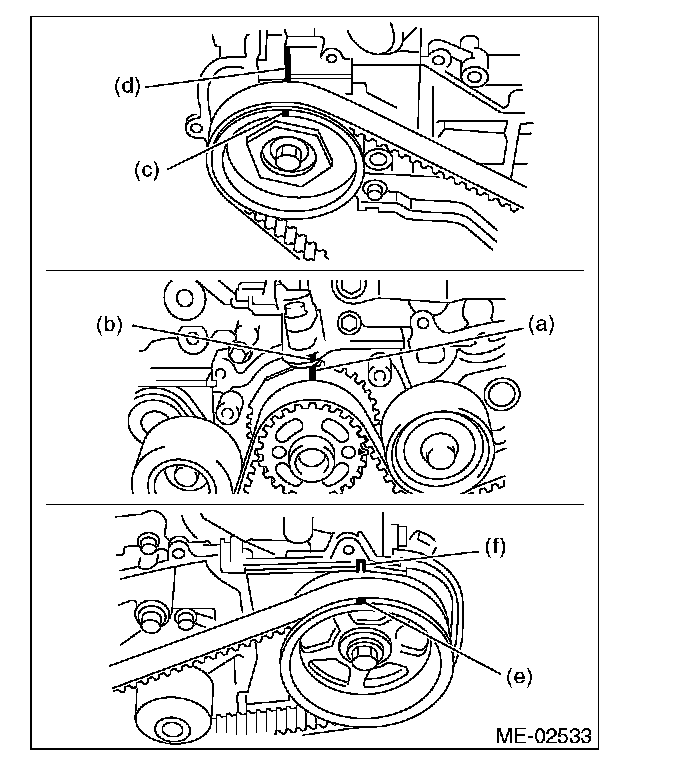 1) Use the ST to turn crankshaft. Align the mark (a) of sprocket to the mark (b) of oil pump, and then ensure the right side cam sprocket mark (c), cam cap and cylinder head matching surface (d) or left side cam sprocket mark (e), timing belt cover notch (f) are properly adjusted.