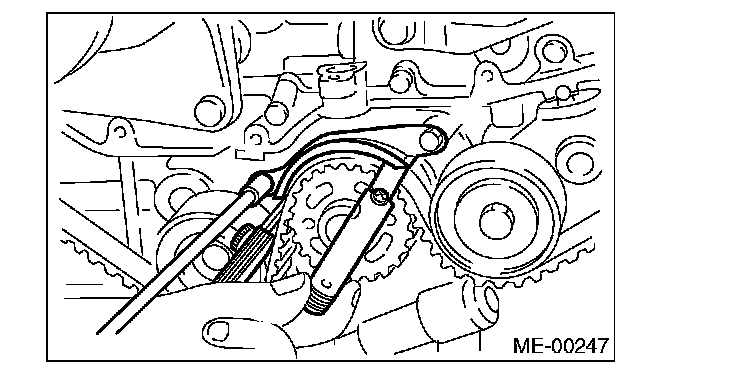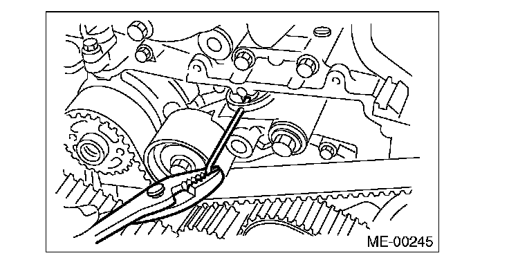 7) After ensuring the marks on timing belt and camshaft sprockets are aligned, remove the stopper pin from belt tension adjuster.