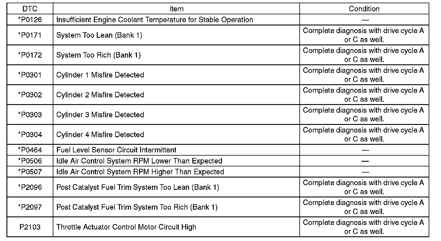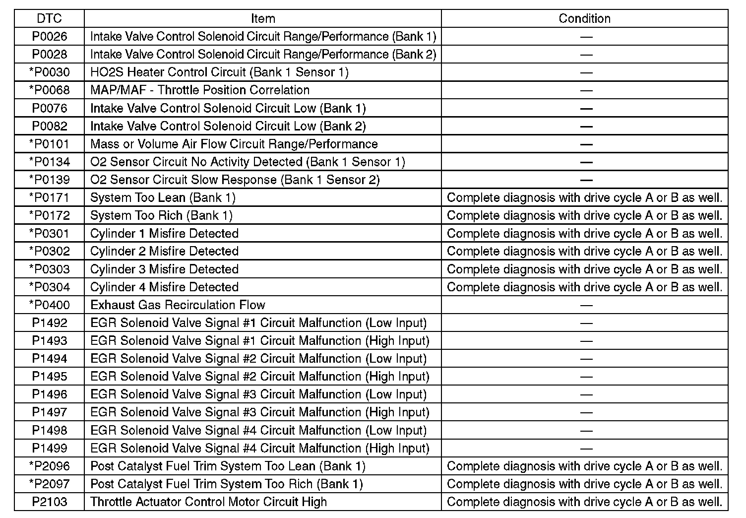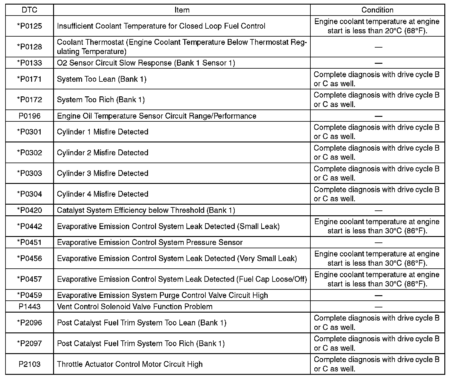 - Perform the diagnosis twice if the DTC marked with *. After completing the first diagnosis, stop the engine and perform second diagnosis in same condition.