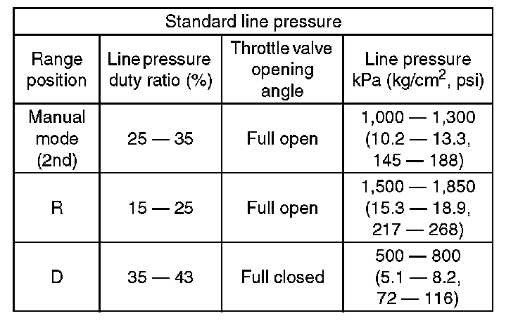 2) Measure the line pressure when the select lever is in "R" or 2nd of manual mode with engine under stall conditions.