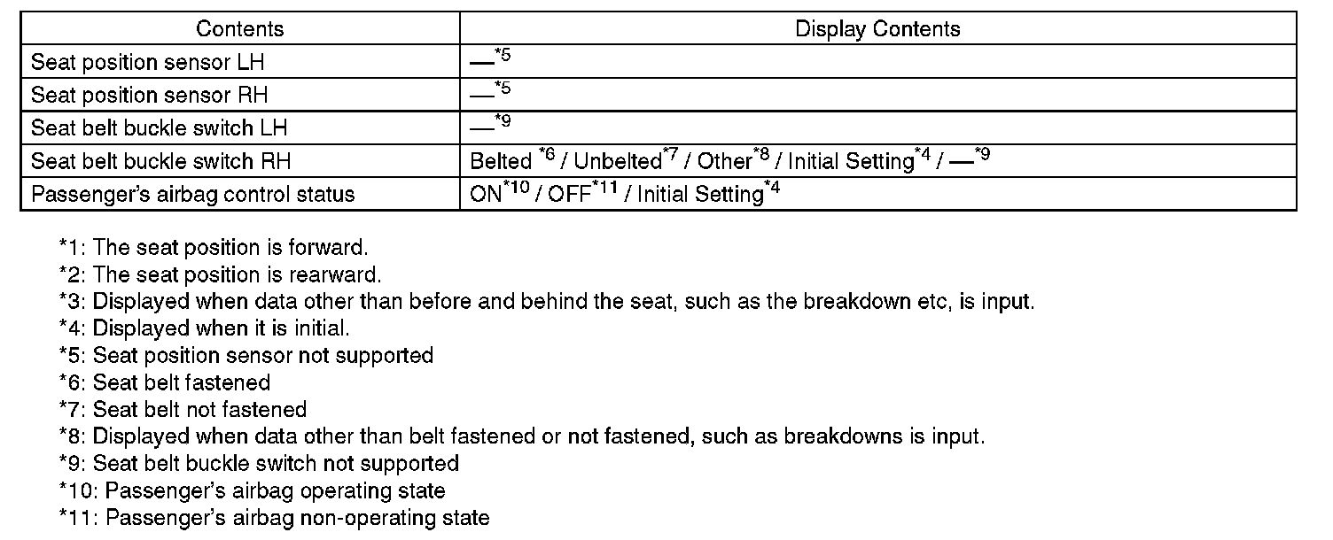 Check the operating condition of each sensor in the event of malfunction in the seat belt buckle switch and seat position sensor, or when the seat belt buckle switch and seat position sensor has been replaced.