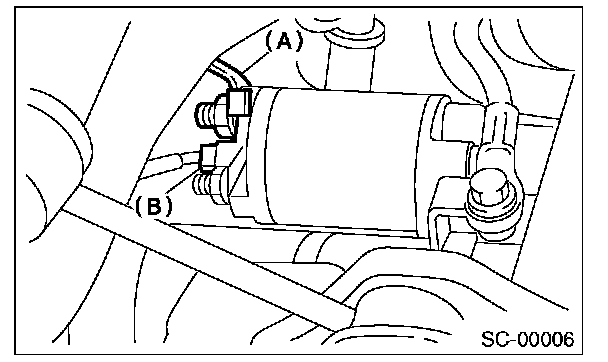 5. Disconnect the connector (B) and terminal (A) from starter.