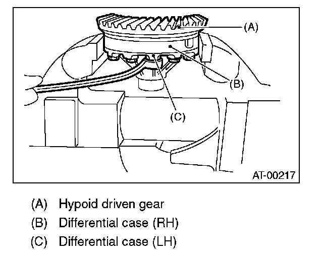 ^ Hold the differential case assembly by hand to avoid damaging the retainer mounting hole of the converter case.