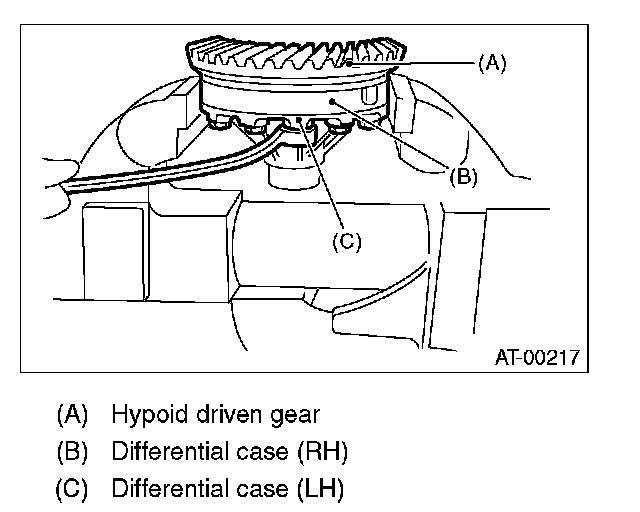 2) Secure the case in a vise, remove the hypoid driven gear tightening bolts, and then separate the hypoid driven gear into differential case (RH) and differential case (LH).