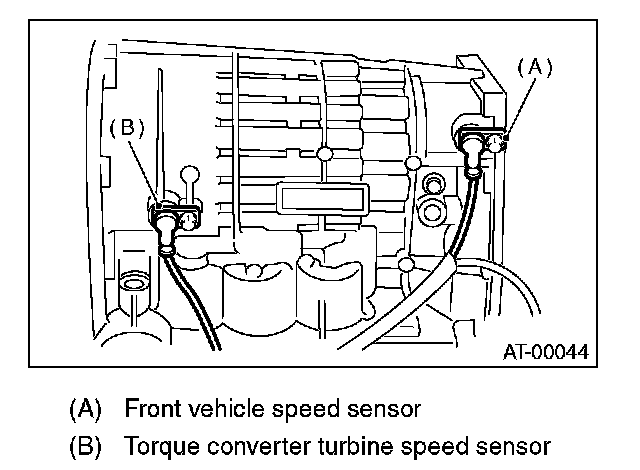 20) Remove the front vehicle speed sensor and torque converter turbine speed sensor.
