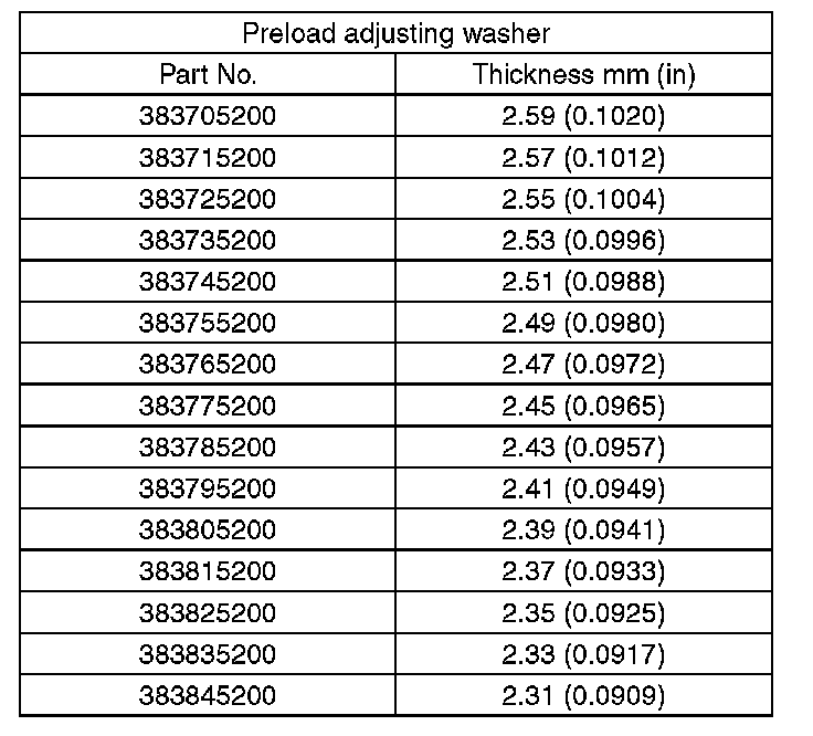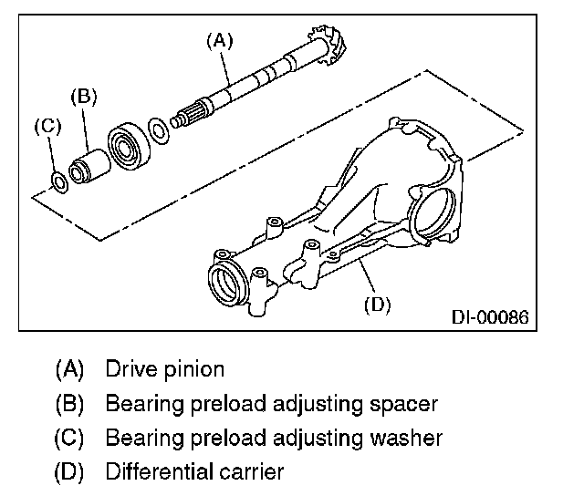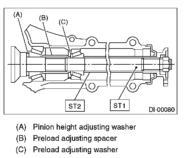 Adjust the bearing preload between front and rear bearings with spacer and washer. Pinion height adjusting washer is not affected by this adjustment. The adjustment must not be carried out with oil seal inserted.