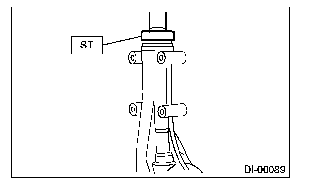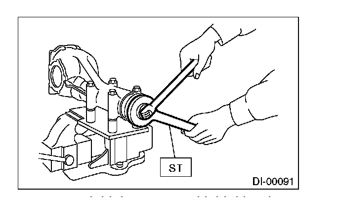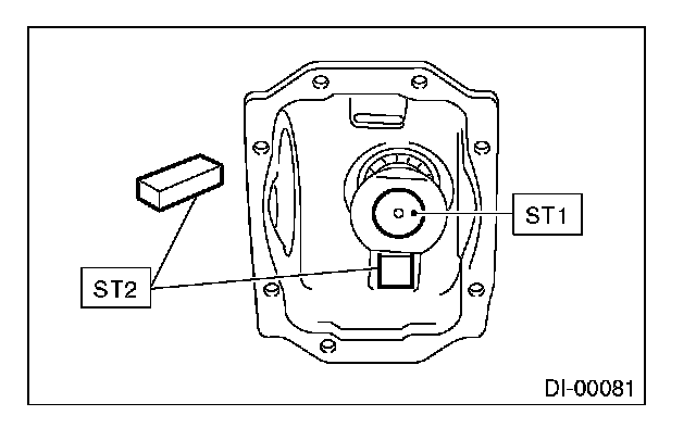 2) Install the front bearing race to the differential carrier using ST1 and ST2.